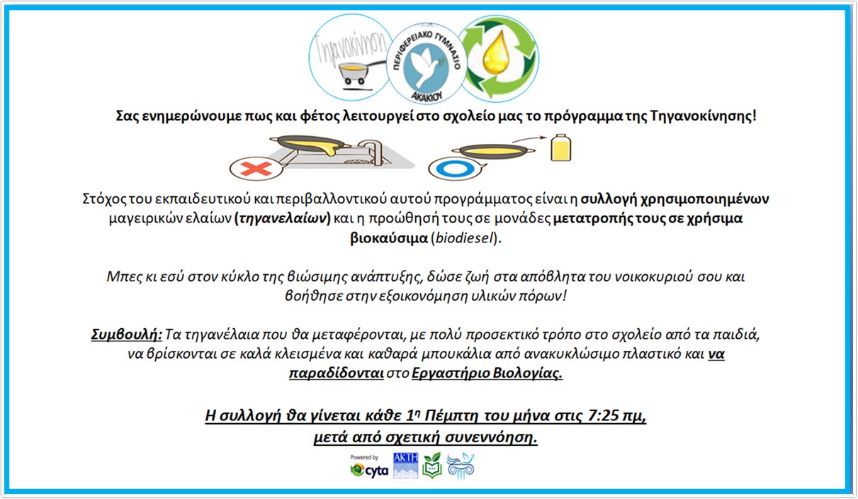 Μπορείτε κι εσείς να συμμετέχετε στο πρόγραμμα «Τηγανοκίνηση» του σχολείου μας! Δείτε τη σχετική ανακοίνωση!
